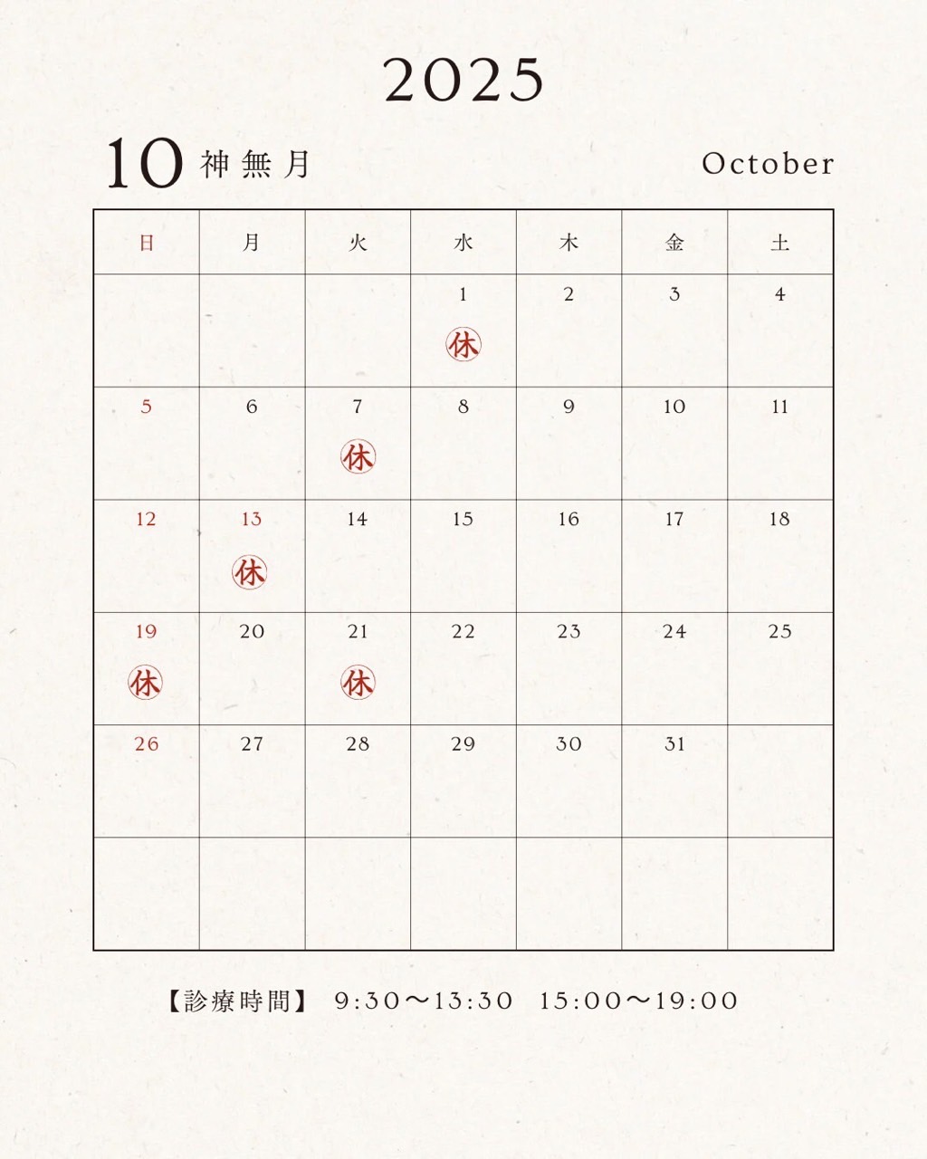 2025年9月29日 / 最終更新日 : 2025年9月29日 tom 診療カレンダー 10月の診療日(休診日)のご案内 当院のホームページを閲覧頂き、誠にありがとうございます。 10月の診療日(休診日)についてご案内させていただきます。 下のカレンダーをご確認下さいませ。何卒宜しくお願い申し上げます。